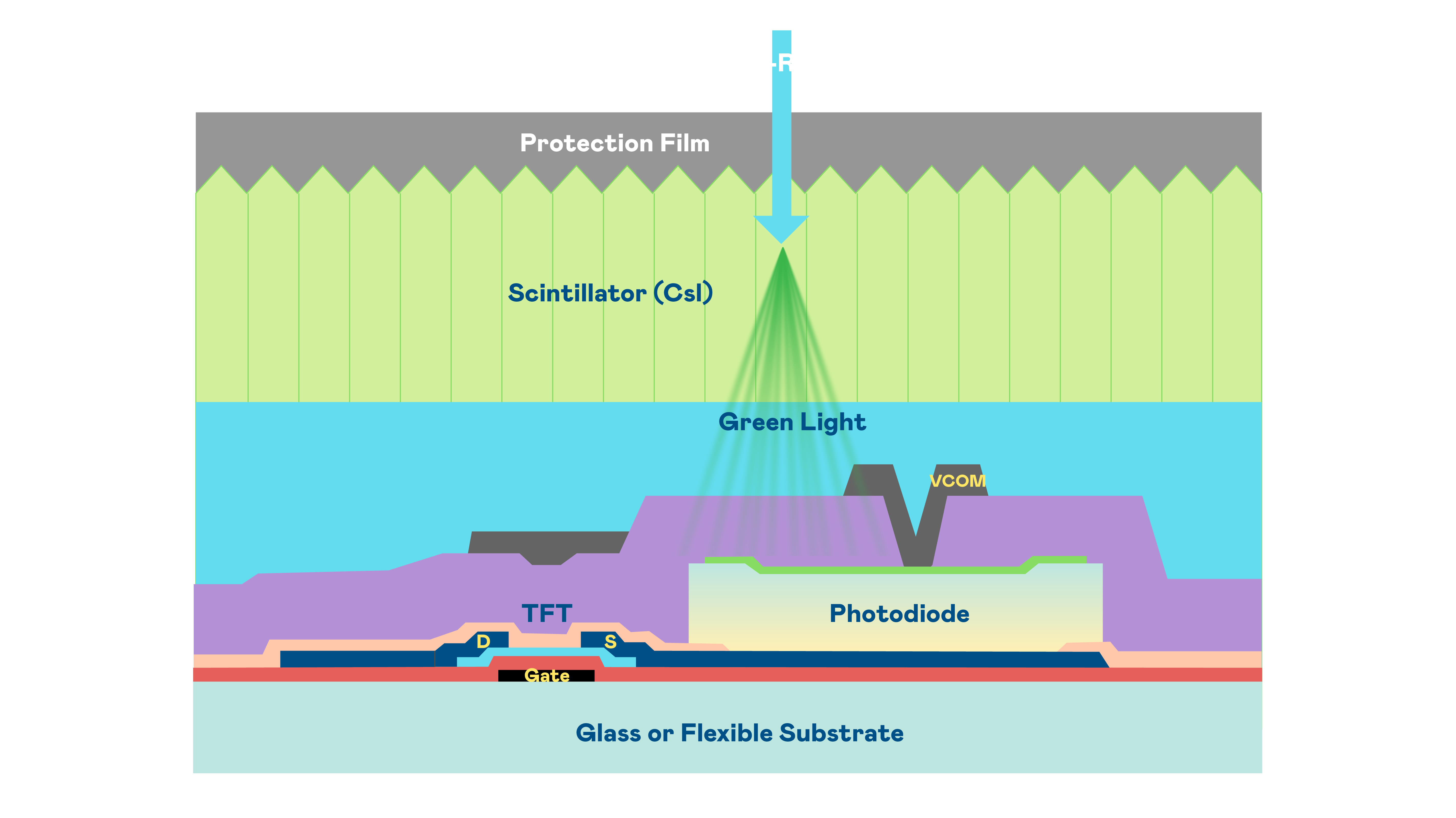 evo视讯的X光影像感測陣列使用薄膜電晶體 (TFT) 作為每個像素的讀取開關,搭配光電二極體(Photodiode)的光電轉換元件,用以感測X光影像訊號。